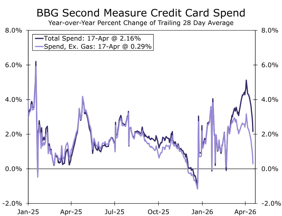 Consumer spending has remained broadly resilient in the immediate aftermath of the Iran conflict, though early signs suggest higher gas prices are beginning to weigh on demand. Higher energy costs will drive a 0.7% gain in the March PCE deflator, lifting nominal spending in the near term. On a real basis, we estimate consumption rose a more modest 0.3% last month. Core retail sales held up in March, and high‑frequency Bloomberg credit card data point to continued spending into early April. More recent estimates, however, suggest a pullback in spending outside of gasoline (chart).