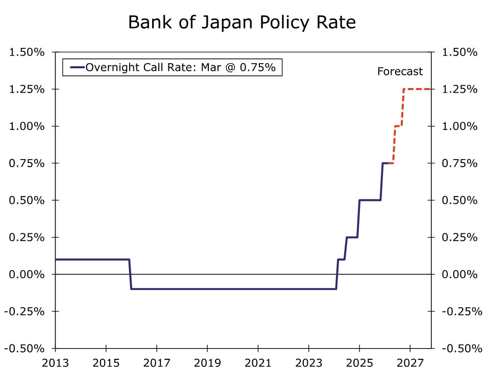The policy direction rather than timing is the key signal, in our view. The BoJ’s revised reaction function explicitly tolerates weaker growth so long as inflation persistence and wage gains remain intact. Our base case remains for a Q2 hike (June), followed by at least one additional increase later in 2026, taking the policy rate to around 1.25% by year‑end. Even at that level, policy would remain only mildly restrictive relative to estimates of neutral. Risks to the outlook are skewed toward higher rates if yen weakness persists or energy prices remain elevated, while a durable de‑escalation in the Middle East represents the main downside risk to the tightening path.