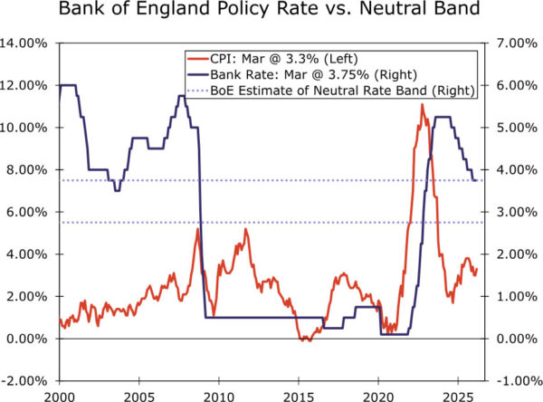 When Bank of England (BoE) policymakers meet next week, we expect that they will keep the Bank Rate on hold at 3.75%. The Monetary Policy Committee’s guidance is likely to continue emphasis on optionality and data dependence, particularly if second-round effects become more pronounced. We expect growth projections to be revised lower and near-term inflation forecasts higher as the energy supply shock reintroduces upside risks to headline persistence, with longer-horizon forecasts largely unchanged. It would take a notably sharp upgrade to the growth outlook or medium-term inflation forecasts well above the 2% target to shift our view toward a tightening cycle this year.