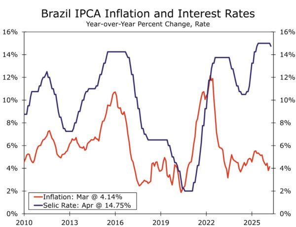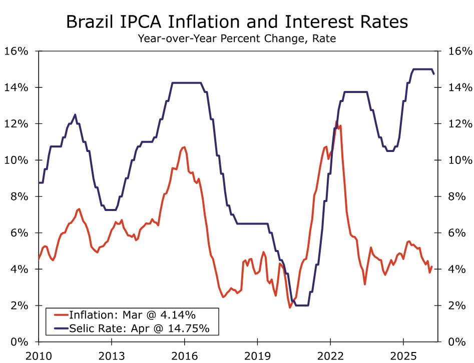 The Banco Central do Brasil (BCB) is likely to cut the Selic by 25 bps next week to 14.50% under our baseline. A strong IPCA‑15 inflation print on Tuesday (Apr 28) could still keep the BCB on hold. Either way, the easing cycle has become shallower, more intermittent, and more data-dependent than it appeared back in February.