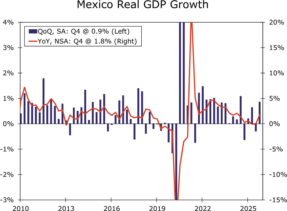 We expect Mexico’s preliminary Q1 GDP reading to print -0.1% quarter-over-quarter from 0.9% in Q4, as early-2026 momentum fades across key domestic drivers. The year-over-year GDP is expected to decline to around 1.1% from 1.8% in Q4. After a strong January, private consumption lost steam in February, with retail sales contracting on the month and slowing sharply year-over-year, led by weakness in fuel, automobiles and food categories. We expect this softening in consumer demand to persist in March in light of energy price shocks. Although industrial activity rebounded on a month-over-month basis in February, it remains in a clear year-over-year contraction amid broad-based manufacturing weakness and elevated trade-related uncertainty. Investment continues to be a material drag, with gross fixed investment still contracting in both month-over-month and year-over-year, reflecting a fragile business climate, policy uncertainty and delayed capex amid USMCA renegotiation risks. Overall, Q1 growth looks below trend and materially weaker than late 2025, with downside risks if March data fail to stabilize. We continue to expect Banxico to remain dovish given the sluggish growth outlook and take advantage of the narrow window on inflation to cut the policy rate one last time in Q2.