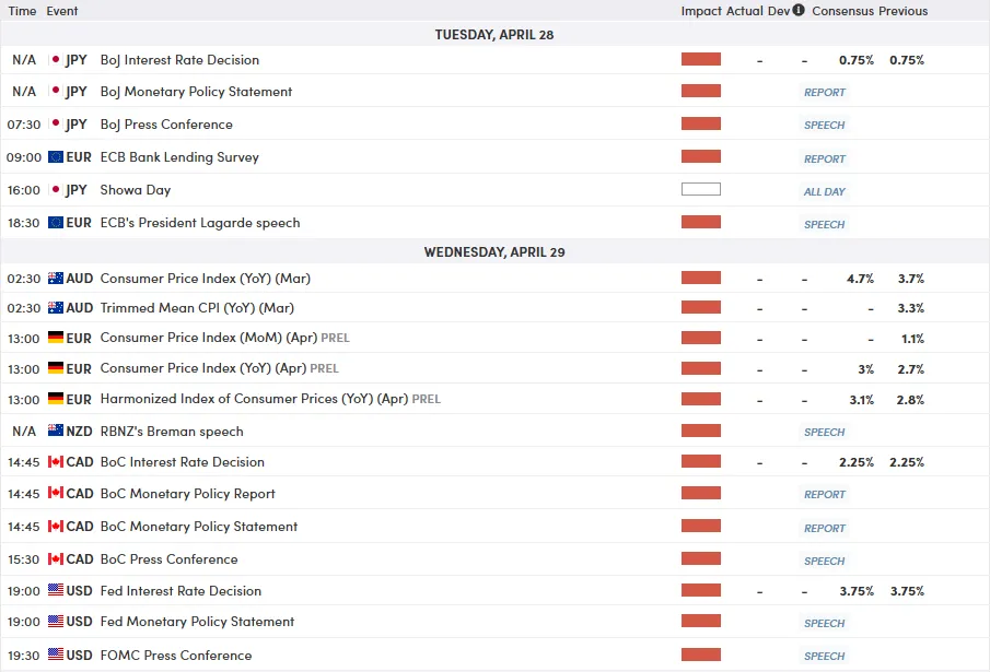 Markets enter the final week of April facing a familiar, albeit intensifying, conundrum. While the “higher for longer” narrative was the theme of 2025, the spring of 2026 is shaping up to be defined by a “wait and see” stalemate. As we look toward the week starting April 26, the spotlight is firmly fixed on a trifecta of central bank meetings with the Fed, ECB, and Bank of England, all of whom find themselves caught between sticky energy-led inflation and a fragile global growth outlook.