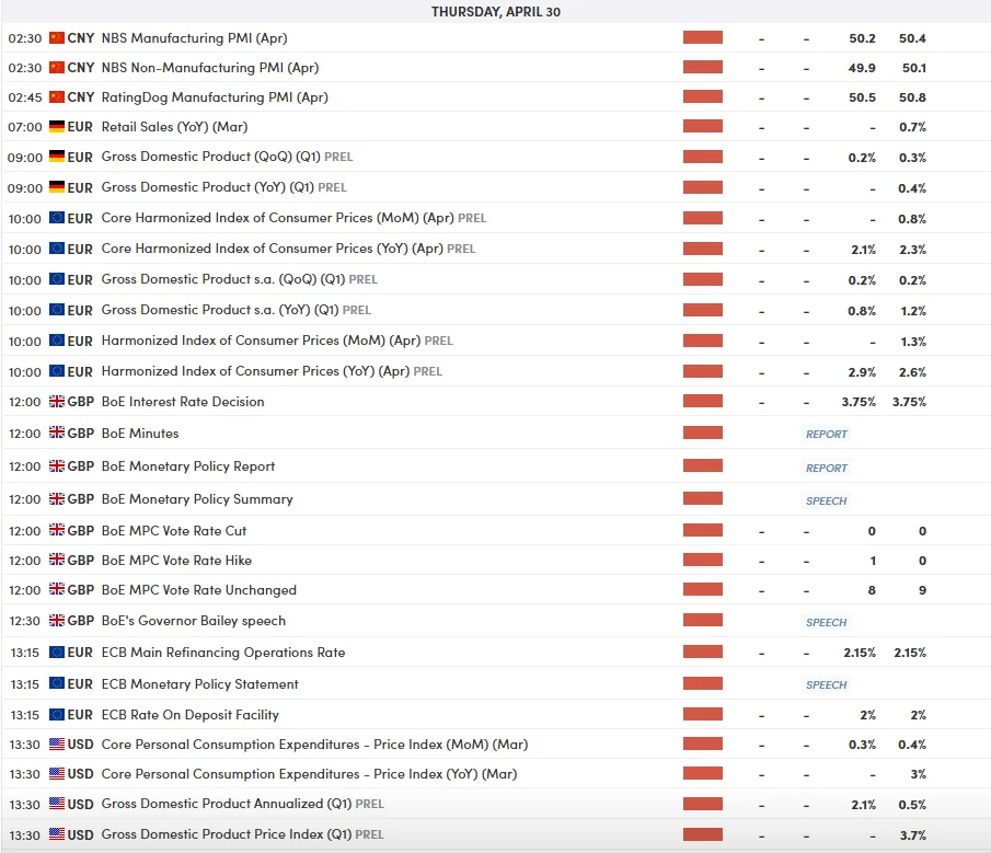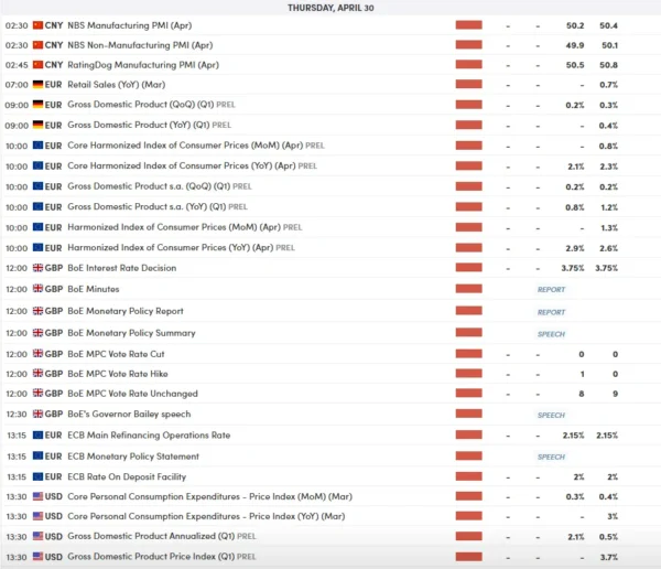 The Fed (Wednesday): Jerome Powell is expected to maintain a steady hand in what is scheduled to be his final meeting as Chair. While the US economy continues to show resilience—with 1Q GDP expected to rebound to 2.7%—the core PCE deflator remains a thorn in the side of the FOMC. Expect a “hold” decision, with Powell likely emphasizing that while the labor market risks are skewed to the downside, the inflation fight is far from over.