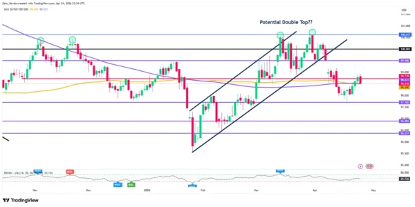 The trend is currently neutral-to-bearish. Watch for a decisive close below the 97.70 handle to confirm a deeper correction toward 97.00.