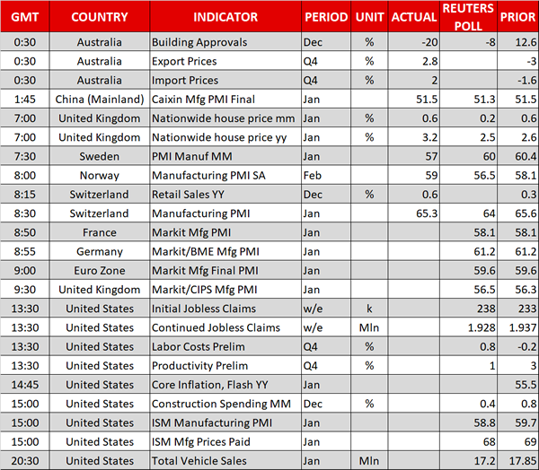 Over in the US, of most interest are likely to be data on weekly initial and continued jobless claims due at 1330 GMT, as well as the ISM’s January manufacturing PMI scheduled for release at 1500 GMT. First-time jobless claims applicants are expected to have increased during the week ending January 27, though not by much and to still remain well below the 300k threshold that’s associated with a healthy labor market. The ISM’s survey on manufacturing activity is projected to reflect a reduction compared to December, though at 58.8 – should expectations materialize – it would still constitute a robust number.