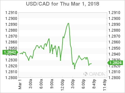 The USD/CAD gained 0.01 percent on Thursday. The currency pair is trading at 1.2829 after a volatile 24 hours that brought the loonie close to the 1.29 price level. Comments from US President Donald Trump on trade triggered a sell off of the Canadian currency. US stocks also retreated as the one two punch of a potential trade war and higher interest rates hit indices. The USD/CAD ended up almost flat as the market awaits more details on the tariffs that could end up with the US issuing exceptions for certain trade partners, which Canada almost surely on that list.