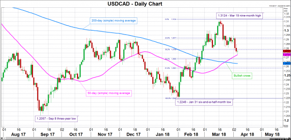 Upbeat data out of Canada are expected to boost the local dollar, exerting downward pressure on the dollar/loonie pair. Support in case of a declining dollar/loonie might come from the range around the current level of the 50-day moving average at 1.2731 and the 50% Fibonacci retracement level of the January 31 to March 19 upleg at 1.2685. Notice that the area around these points was congested in previous months, as well as that the 200-day MA lies not far below this area at 1.2633.