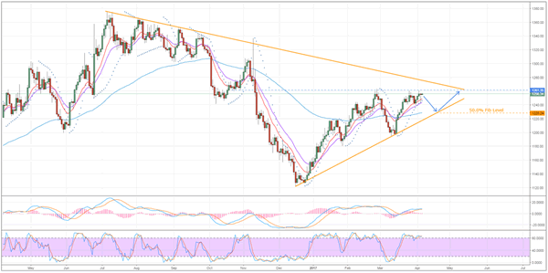 Firstly, we need to understand whether the bears or the bulls are likely to be in command of the metal in the near-term. At present, the bias seems to be in favour of the bears for a number of reasons. For one, gold prices are battling against a fairly robust zone of resistance that has previously remained unbroken. In addition to this, stochastics are overbought and the MACD is on the cusp of having a bearish signal line crossover.