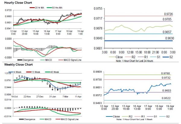 The pair is expected to find support at 0.9657, and a fall through could take it to the next support level of 0.9630. The pair is expected to find its first resistance at 0.9705, and a rise through could take it to the next resistance level of 0.9726.