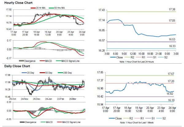 The pair is expected to find support at 16.53, and a fall through could take it to the next support level of 16.33. The pair is expected to find its first resistance at 17.05, and a rise through could take it to the next resistance level of 17.38.