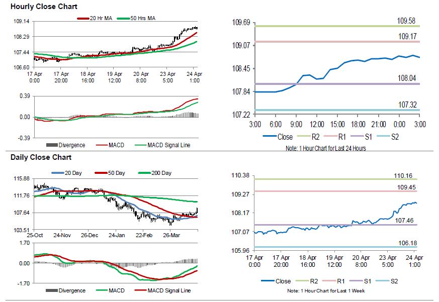 For the 24 hours to 23:00 GMT, the USD rose 0.83% against the JPY and closed at 108.7.
