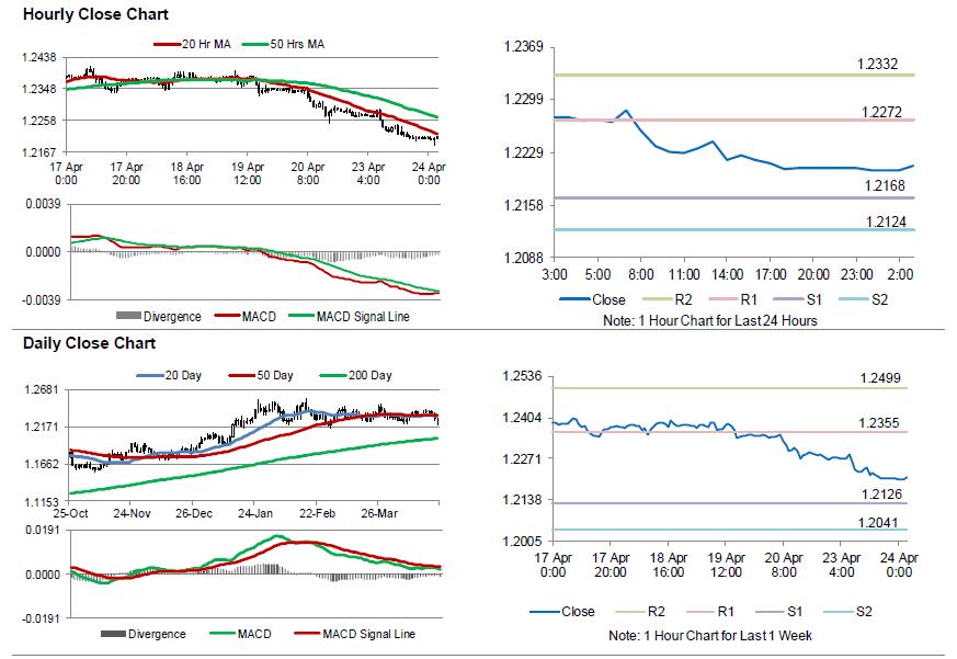 For the 24 hours to 23:00 GMT, the EUR declined 0.55% against the USD and closed at 1.2208, after downbeat manufacturing sector data across the Euro-zone stoked concerns about the loss of economic momentum in the common currency bloc.