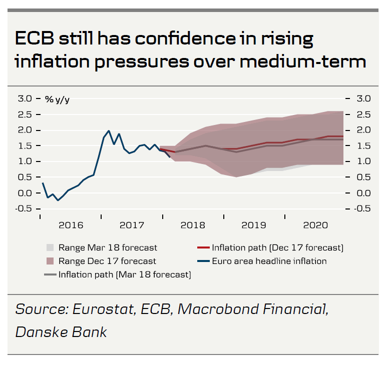 What is the outlook from here? A temporary increase in headline inflation in the coming months is likely because of energy price inflation, but we expect the underlying price pressure to stay subdued going forward. Although we look for a rebound in core inflation to 1.0% in May, our view remains that core inflation will rise only very gradually during 2018, averaging 1.1% before accelerating to 1.4% in 2019 on the back of rising wage growth and service price inflation.