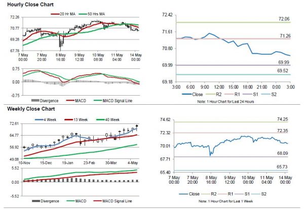 For the 24 hours to 23:00 GMT, Crude Oil declined 1.36% against the USD and closed at USD70.56 per barrel on Friday, after fresh figures from Baker Hughes disclosed that active oil rigs in the US rose for the sixth straight session by 10 to 844 in the week ended 11 May and amid uncertainty over the US sanctions against Iran.