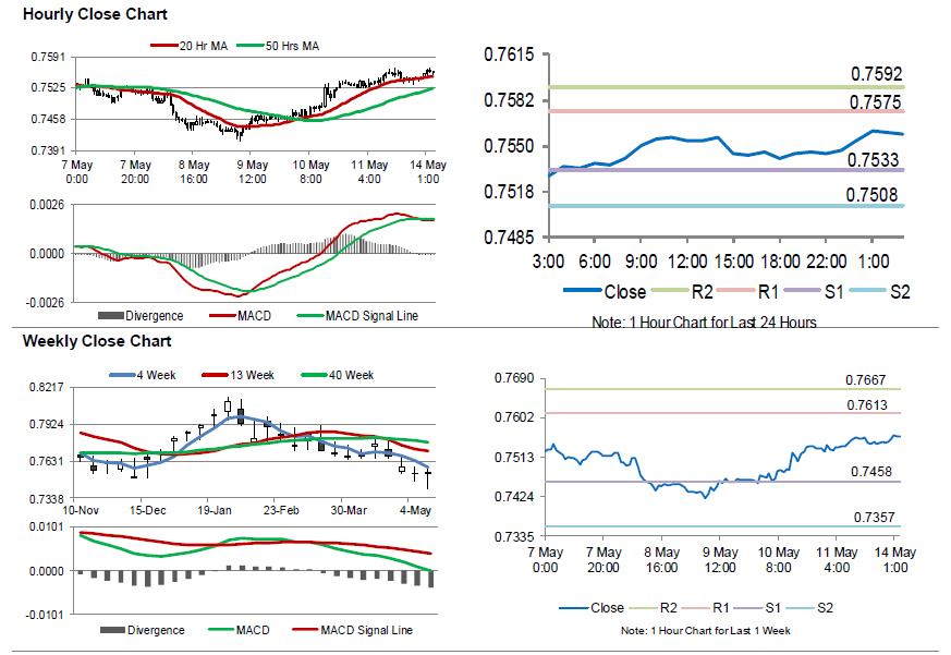 The pair is expected to find support at 0.7533, and a fall through could take it to the next support level of 0.7508. The pair is expected to find its first resistance at 0.7575, and a rise through could take it to the next resistance level of 0.7592.