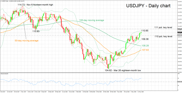 STOCKS: Wall Street closed higher yesterday, even despite a continued climb in US Treasury yields, a factor that has been limiting advances in stocks recently. The Nasdaq Composite climbed 0.63%, while the S&P 500 and the Dow Jones rose by 0.41% and 0.25% respectively. The gains come ahead of a meeting today between China’s Vice Premier Liu He and key US officials including Treasury Secretary Mnuchin in Washington. The topic will be trade issues, and any relevant comments could well impact US equities today. Futures tracking the Dow, S&P, and Nasdaq 100 are all flashing red, pointing to a lower open. In Asia, Japan’s Nikkei 225 and the Topix rose by 0.53% and 0.45% correspondingly, though in Hong Kong the Hang Seng fell by 0.44%, even though tech giant Tencent (+5.2%) reported strong earnings. In Europe, futures tracking the major indices were all close to neutral levels, with the exception being Italy’s FTSE MIB, which is expected to open much higher.