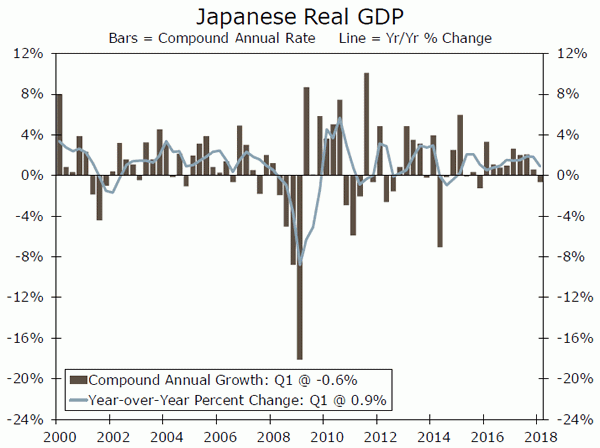 As we have discussed in this report in recent weeks, the pace of economic growth in most major economies slowed in the first quarter. Not only did the sequential rate of U.S. real GDP growth downshift a bit, but the Eurozone and the United Kingdom also posted slower rates of growth in Q1. Data released this week showed that real GDP actually contracted in Japan in the first quarter. Specifically, real GDP declined at an annualized rate of 0.6 percent in Q1, the first contraction in the sequential rate of growth in nine quarters.