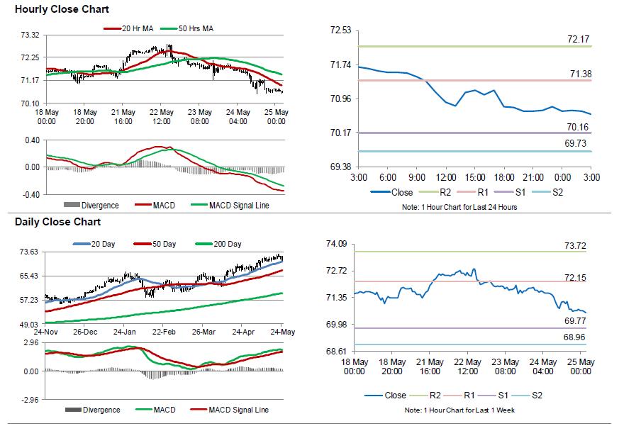The pair is expected to find support at 70.16, and a fall through could take it to the next support level of 69.73. The pair is expected to find its first resistance at 71.38, and a rise through could take it to the next resistance level of 72.17.