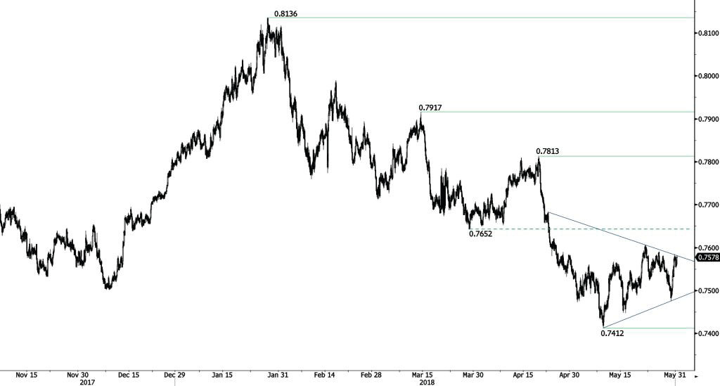 In the long-term, the upward trend slows down after failing to reach key resistance at 0.8164 (14/05/2015 low). Key support stands at 0.6009 (31/10/2008 low). A break of the key resistance at 0.8164 (14/05/2015 high) is needed to invalidate our long-term bearish view.