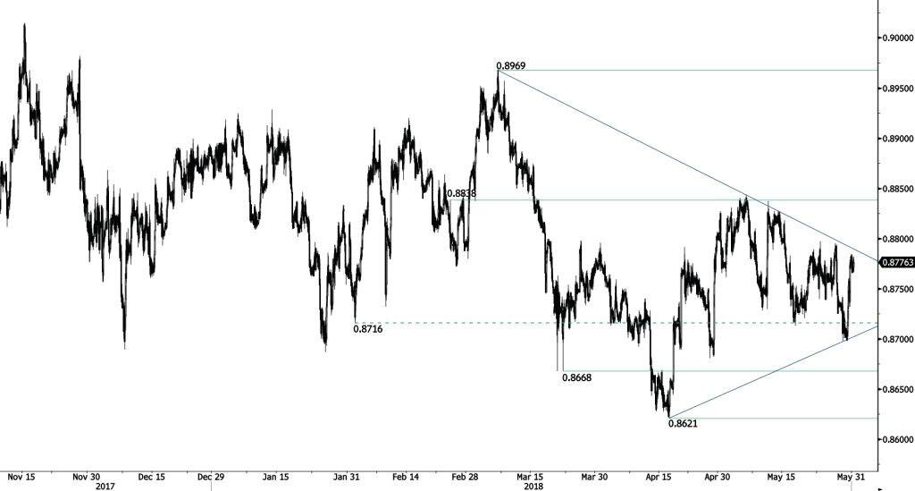 EUR/GBP has experienced a pickup in buying interest near the support at 0.8699. Next support and resistance are given at 0.8668 (22/03/2018 low) and 0.8838 (23/02/2018 high). The technical structure suggests short-term upward moves.