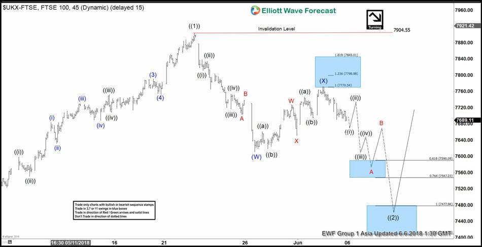 FTSE short-term Elliott wave view suggests that the rally to 7903.50 high on 5/22/2018 peak ended primary wave ((1)). This rally to 7903.5 starts from 3/23/2018 low and took the form of an impulse Elliott wave structure. The index is currently in Primary wave ((2) pullback to correct cycle from 3/23/2018 low.