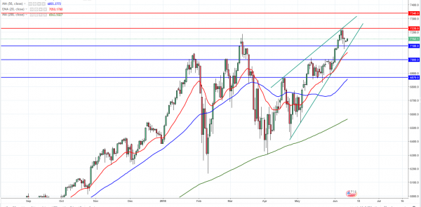 On the daily chart, the Nasdaq 100 (NDX) broke to new all time highs last week. The index is now trading in a potential ascending wedge and if broken could lead to a correction. A break 7100 could open the door to a move lower to support at 7000 followed by 6870. However, as long as 7100 holds, another test of high at 7228 is possible and a break should see the index push towards the Fibonacci extension at 7340.