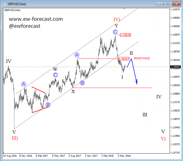 GBPUSD was trading slow, overlapping and choppy for a big chunk of 2016-2018, probably because of a correction that was unfolding within a bigger wave IV. It turned out to be a complex correction, which found a top at the 1.4384 level, and afterwards push price strongly into the bearish side. If we look closely, we can see the lower channel line connected from 2016 lows was breached which in Elliott wave theory indicates a change in trend, and probably a new five-wave bearish cycle.