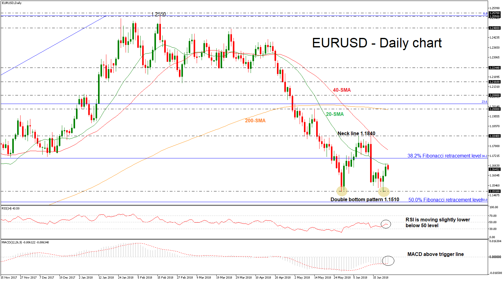 EURUSD has been underperforming over today’s session, after the bounce off the 20-day simple moving average in the short-term. The world’s most traded currency pair is trying to snap the two consecutive winning days, while it is in the process of forming a double bottom pattern with trough the 1.1510 barrier and with neckline the 1.1840 resistance level.