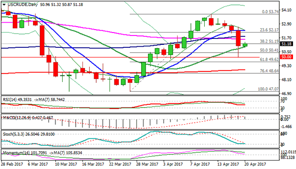US oil holding within narrow daily cloud (spanned between ($50.74 and $51.15) following bounce from Wednesday’s spike low at $ 50.06.