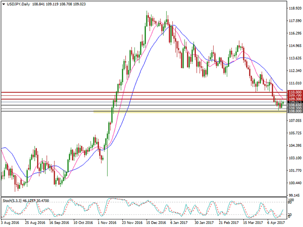 Monday April 17, USD/JPY hit the lowest level of 108.12 since November 15, as a result of the strengthening of the yen on markets’ safe haven demand.
