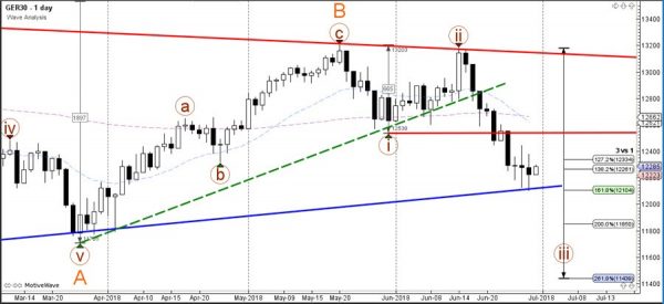 The DAX bounced at the 78.6% Fibonacci resistance level of wave B (orange). The current momentum is probably a bearish wave 3 (dark red) but price will need to break below the support trend line (blue) otherwise an ABC wave pattern and triangle chart pattern is possible too. A bearish breakout could see price move towards Fib targets.