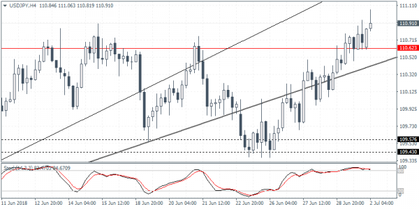 USDJPY (110.84): The USDJPY currency pair broke past the resistance level of 110.62 quite comfortably. In the near term, any declines are likely to hold out at 110.62 which could now serve as support. The sharp parabolic gains however come at a risk of a downside breakout. A close below 110.62 could signal a move lower toward the support at 109.57 – 109.43 region.