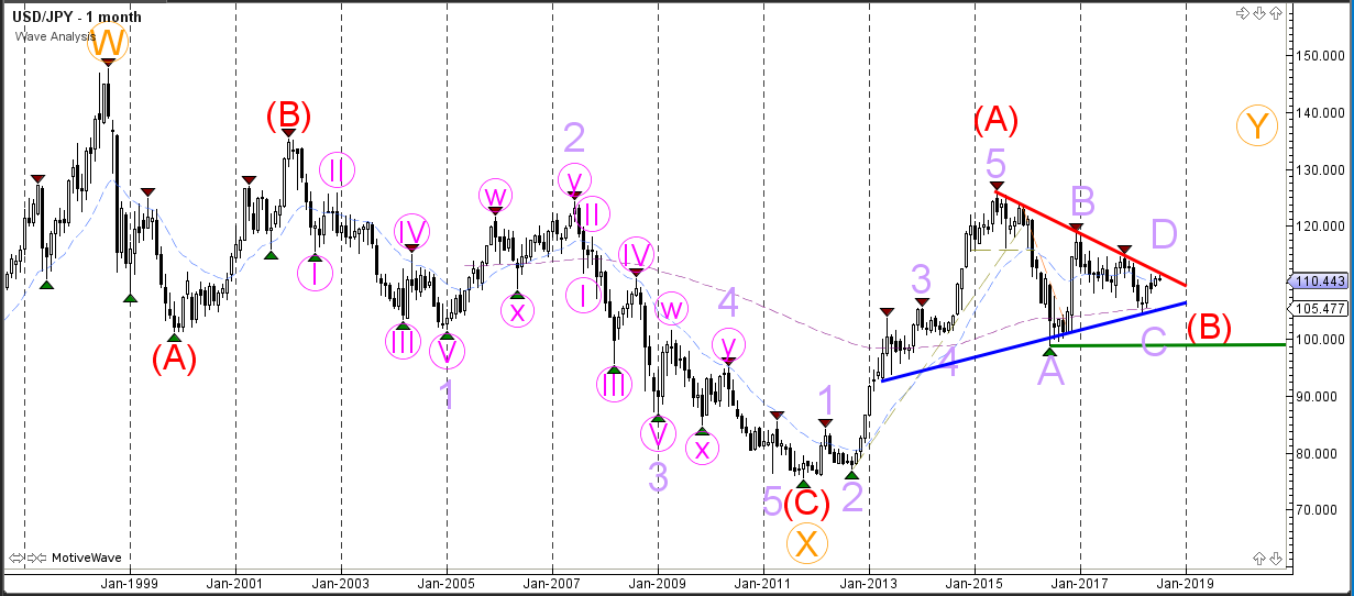 The USD/JPY is in the wave D (light purple) of the triangle pattern.