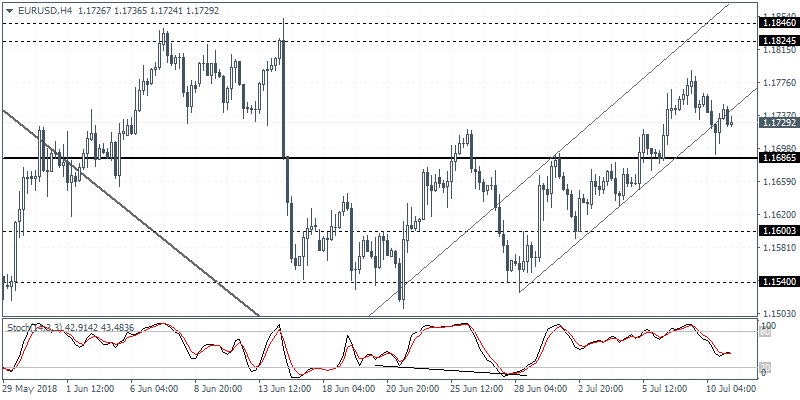 EURUSD (1.1729): The EURUSD currency pair was seen posting modest declines on the day as price action remains consolidating around the 1.1730 level. The daily chart signals a hidden bearish divergence to the Stochastics which suggests a near term decline. The initial support at 1.1686 remains the first level of support that could be tested. In the event of a break down below this level, then the EURUSD could be seen testing 1.1600 level to the downside.