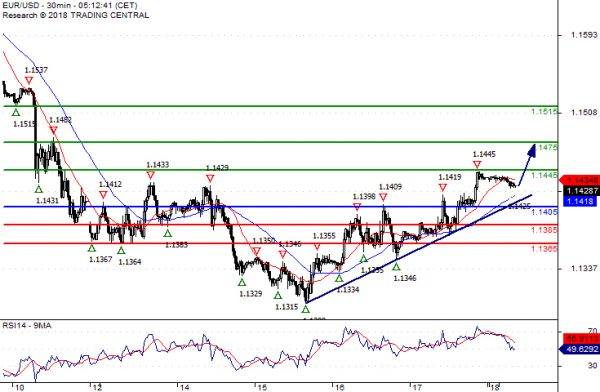Our preference Long positions above 1.1405 with targets at 1.1445 & 1.1475 in extension.