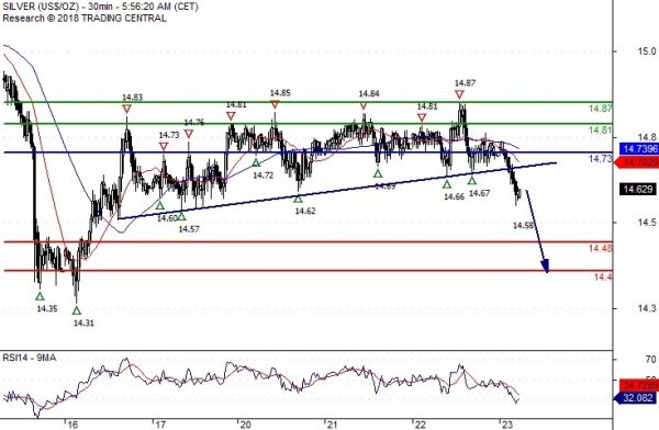 Our preference Short positions below 14.7300 with targets at 14.4800 & 14.4000 in extension.