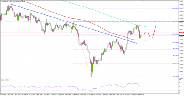 The price settled above the $1,200 level and the 100 simple moving average (red, 4-hours). Additionally, there was a clear break of the 76.4% Fib retracement level of the last decline from the $1,217 high to $1,160 low.