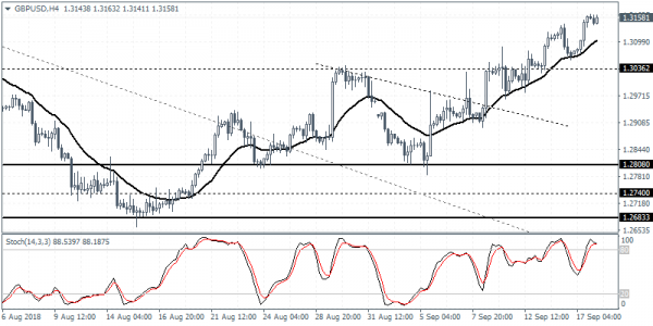 GBPUSD (1.3158): The GBPUSD currency pair extended the gains following the rebound off the 20 periods EMA on the 4-hour chart. Price action is expected to inch higher toward 1.3205 which remains the main target for now. A retest of the resistance level here could potentially keep the cable within the range until a breakout emerges. Further gains can be anticipated on a breakout above the resistance level. To the downside, the support at 1.3036 is expected to hold.