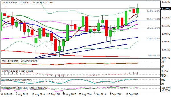Solid supports lay at 111.87/75 zone (broken Fibo 61.8%/former highs/rising 5SMA), ahead of rising 10SMA (111.50, loss of which would signal reversal. Bullish scenario needs clear break above 112.37 Fibo barrier to signal bullish continuation and unmask key resistance at 113.17 (19 July high).