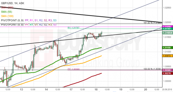 The British pound appreciated 0.77 % against the US Dollar since Monday’s session. During Tuesday morning hours, the currency exchange pair broke the upper boundary of the medium ascending pattern to trade near the weekly R1 at the 1.3178 mark and the monthly R1 at the 1.3185 mark.