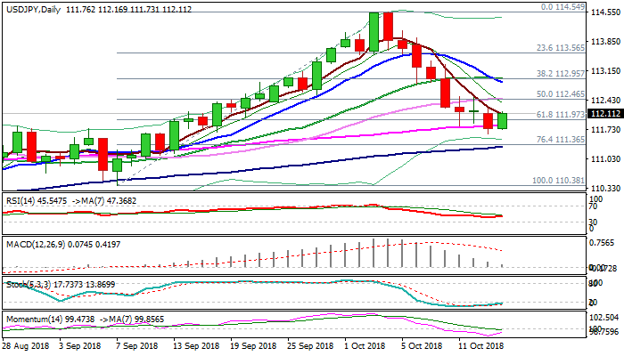 The pair bounces from one-month low on Tuesday, as selloff in global stock markets eased, reducing safe-haven demand. Japanese yen advanced in past two weeks on strong fall in stock markets as well as uncertainty over US/China trade war, which boosted its safe-haven appeal. Bounce comes after larger bears were contained by rising 55SMA and strongly oversold daily studies warned of correction. Reversing slow stochastic and momentum support the action, but overall structure remains firmly bearish and favors further weakness after correction. Repeated close below Fibo support at 111.97 (61.8% of 110.38/114.54) and final break below 55SMA are needed to signal bearish continuation towards 111.32/00 (100SMA/round-figure). Monday’s high at 112.23 marks initial resistance with extended upticks to be ideally capped by 30SMA (112.45). Lift above 20SMA (112.95) would neutralize bears and signal reversal.