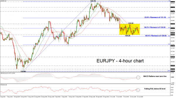 EURJPY has been trading within a consolidation area in the very near term with upper boundary the 130.50 resistance level and the lower boundary the 129.20 support hurdle since October 8. The price headed lower in the previous session and is supported by the technical indicators. The RSI is moving south in the negative zone, while the MACD oscillator hovers near the zero line.