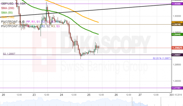 On Thursday, the British pound will trade sideways due to supports of the weekly S2 at 1.2880 and the 62.20% Fibo at 1.2867. It is expected that the currency exchange pair will be trading at the 1.2880 level. Meanwhile, the 55-hour SMA will try to catch up the rate to resist the rate during the day.