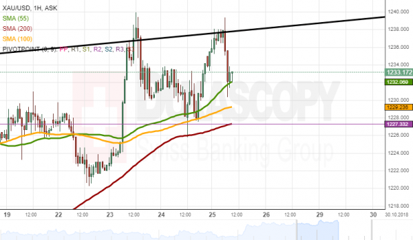 During Wednesday’s trading session, the yellow metal surged to the upper boundary of the dominant ascending pattern at 1,238.00 to end the trading day at 1,235.36 mark. On Thursday morning, the gold was retraced by the dominant pattern line to trade at the 1,233.25 mark.