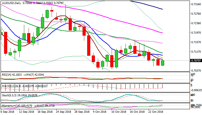 Momentum broke into positive territory and slow stochastic is about to reverse from oversold zone, supporting idea of stronger recovery, but extension and close above 0.7102/10 (10SMA/base of 4-hr cloud/falling 20SMA) is needed to confirm scenario and sideline existing risk of retesting key support – 0.7040 zone base.
