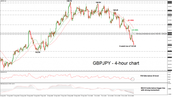 GBPJPY has tumbled to a fresh six-week low of 143.46, falling back below the 145.00 handle. The aggressive selling interest started after the pullback on the 149.50 resistance level on October 8, and the pair is set to record the fifth consecutive red day. The RSI indicator is confirming the strong negative structure by dropping in the oversold zone below the 30 level, while the MACD oscillator sank below the trigger line, in the bearish territory.