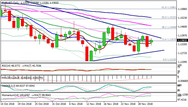 Fresh rally left higher low at 1.1305 (posted on Friday after 0.65% fall for the day) and retraced so far 76.4% of Friday’s 1.1400/1.1305 fall and neutralized immediate downside risk, signaled by Friday’s long red daily candle.
