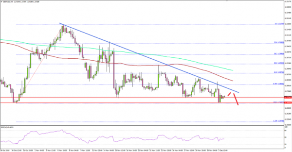 On the upside, there is a crucial bearish trend line in place with resistance near 1.2770. However, a proper close above the 1.2900 level and the 100 simple moving average (red, 4-hours) is needed for a solid rebound in the near term.