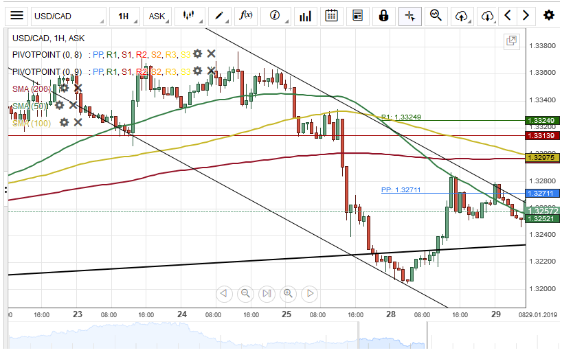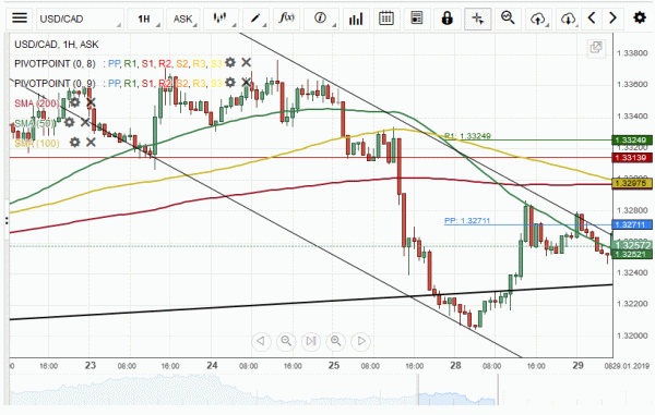 The US Dollar gained about 0.62% of its values against the Canadian Dollar on Monday. The currency pair bounced of its lower boundary of a junior descending channel pattern at 1.3200 during yesterday’s trading session.