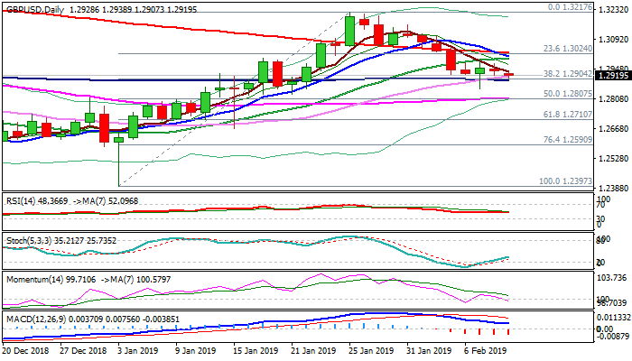 Fresh weakness pressures again pivotal 1.29 support zone (Fibo 38.2% of 1.2397/1.3217 / 30SMA / 100SMA) which was cracked last week, but without clear break lower.